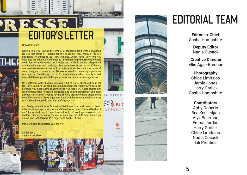 Parlons is the University of London Institute in Paris' student magazine. As Editor-in-Chief of the magazine, I oversaw all operations from social media channel strategy to quality control for print and online publication. I primarily collaborated with fellow student and graphic designer, Ellie Agar-Brennan, to revitalise the editorial layout and the Franco-British brand identity. We focused on showcasing student artwork, such as photography and poetry.